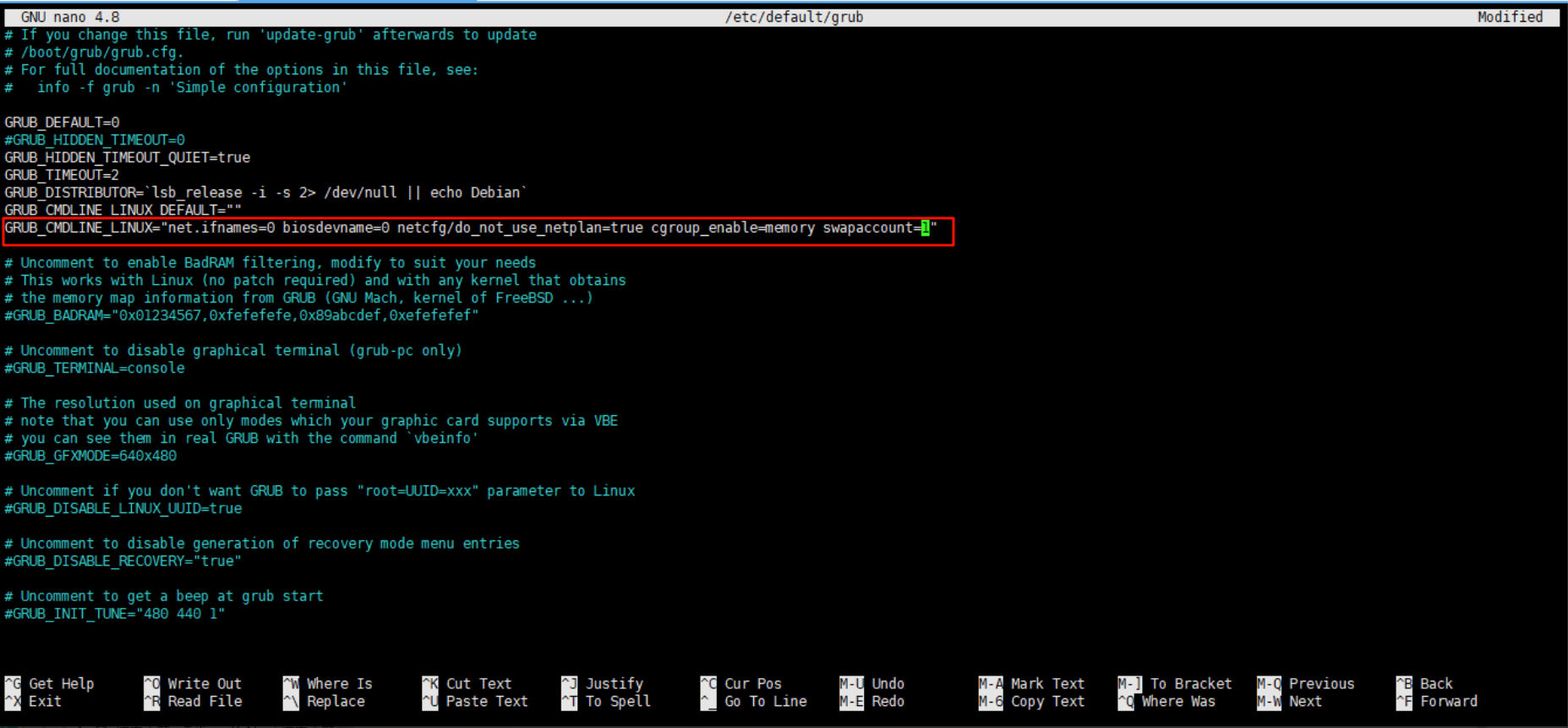 GRUB_CMDLINE_LINUX="net.ifnames=0 biosdevname=0 netcfg/do_not_use_netplan=true cgroup_enable=memory swapaccount=1"