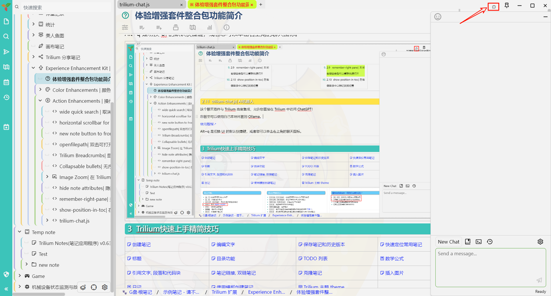 - 集成chat机器人 trilium-chat.js,并自己汉化了部分菜单,您可能会用到。