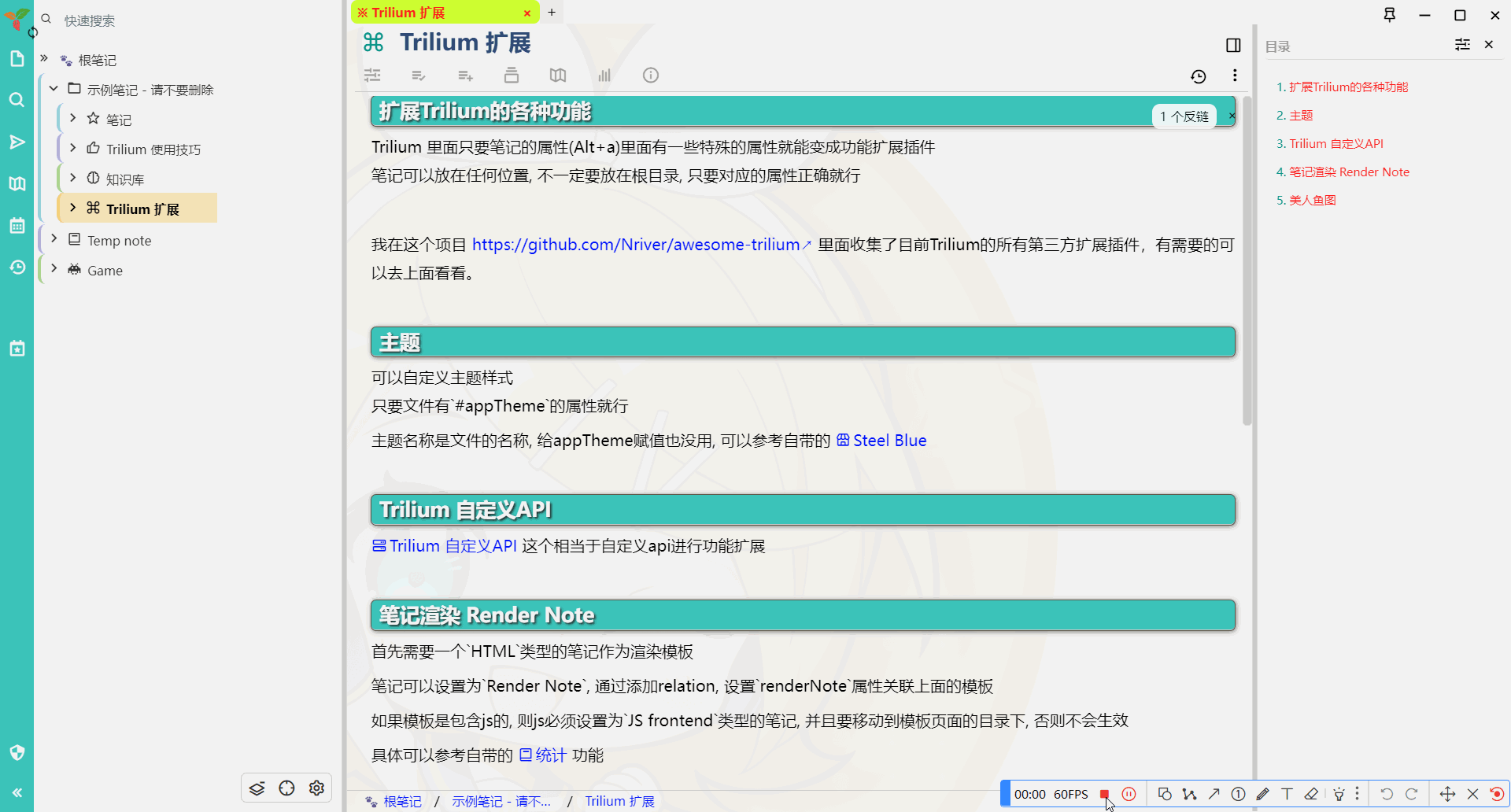 在示例笔记中,你会发现有Nriver整理的详细使用教程,涵盖了Trilium Notes笔记的各种特性。