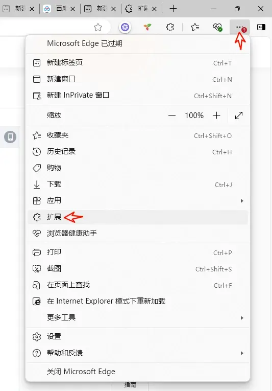 - Edge浏览器右上角点击 ··· ,找到扩展,进入扩展页面。