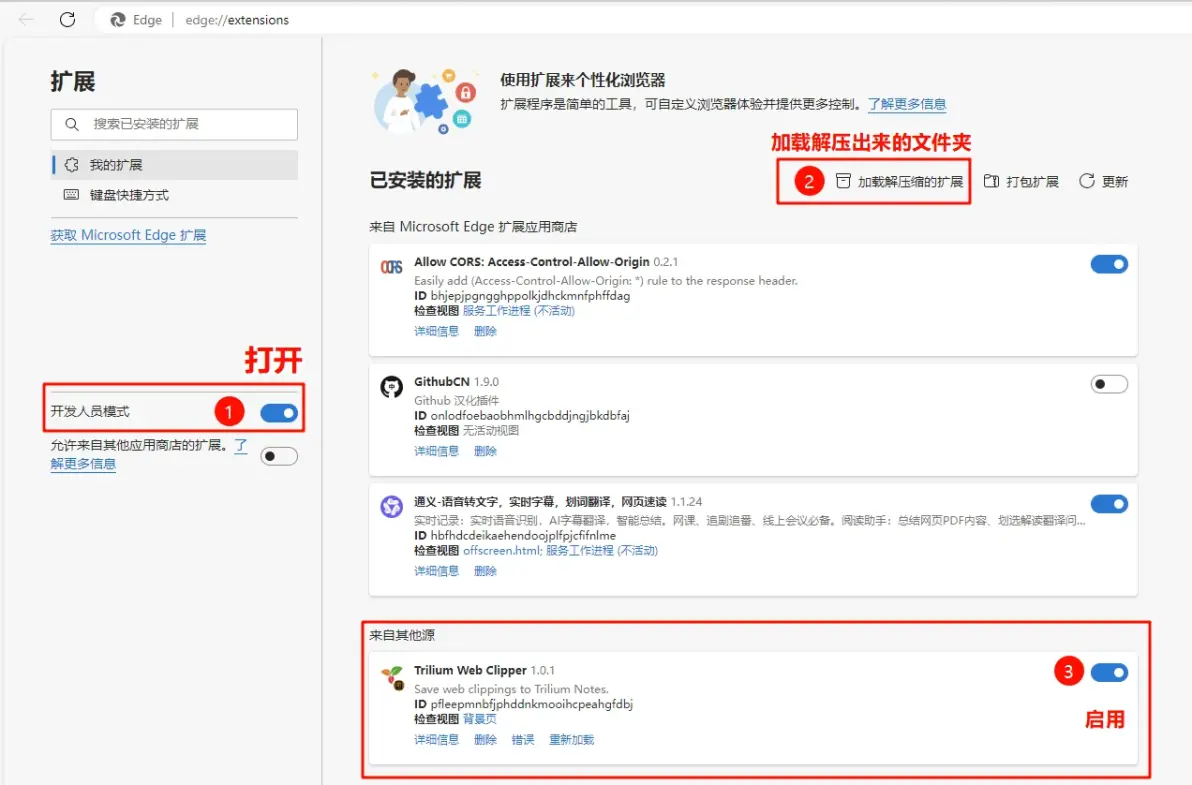 - 开发人员模式下,加载压缩包,启用Trilium Web Clipper