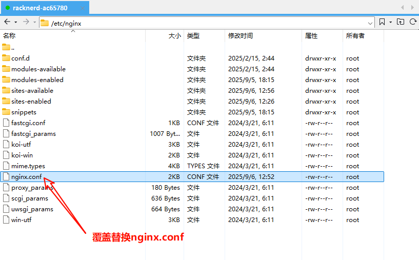 ✅ 第 5 步:替换服务器上/etc/nginx路径下的nginx.conf文件