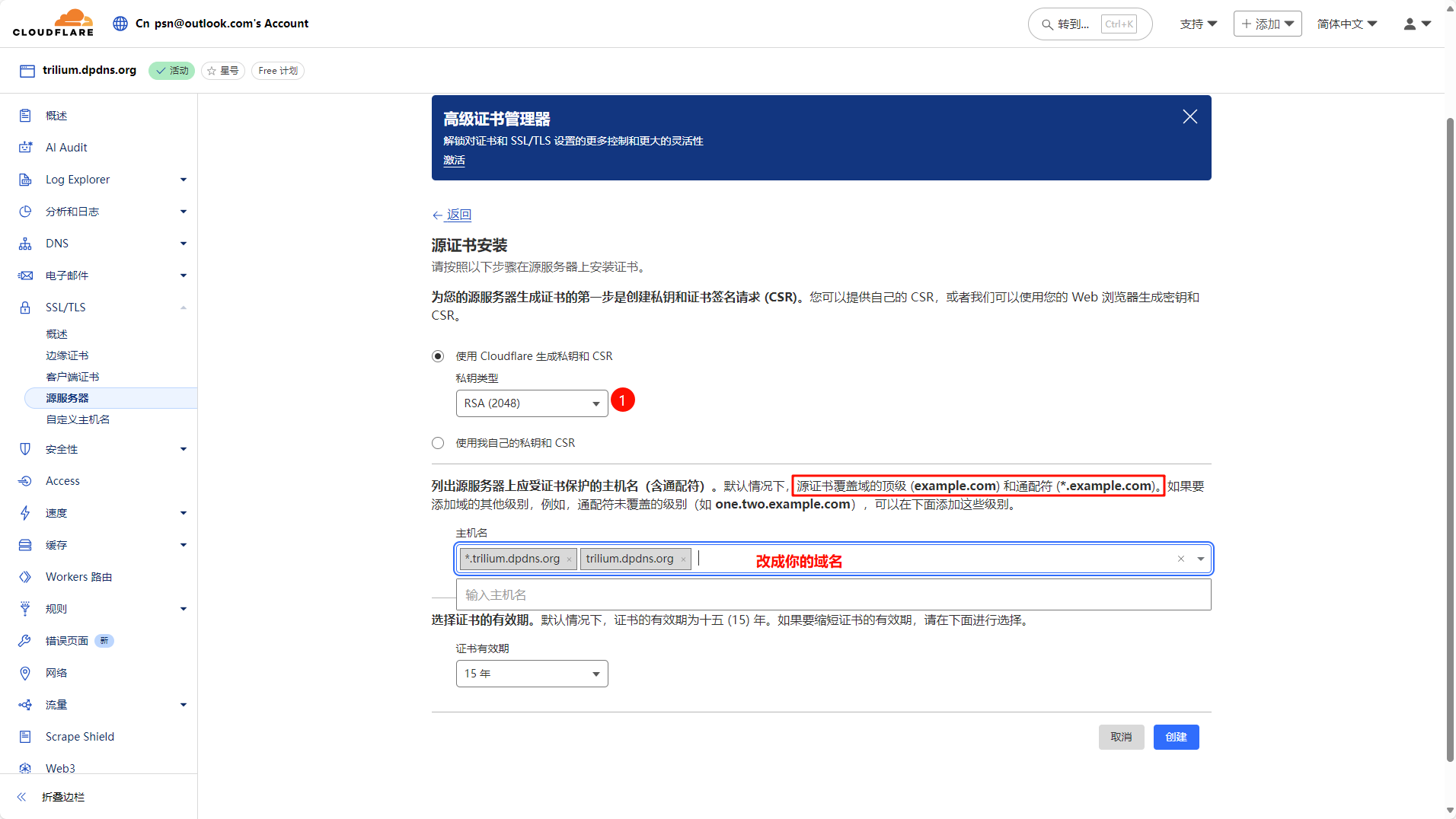 主机名填写你自己绑定的域名,例如我的设置是这个:trilium.dpdns.org 和*.trilium.dpdns.org,有效期选择15年。