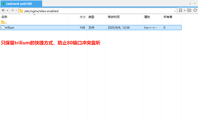 ✅第 6 步:检查服务器上/etc/nginx/sites-enabled路径下的只保留trilium的快捷方式,删除/etc/nginx/sites-enabled路径下nginx可能生成的default文件,防止80端口冲突。