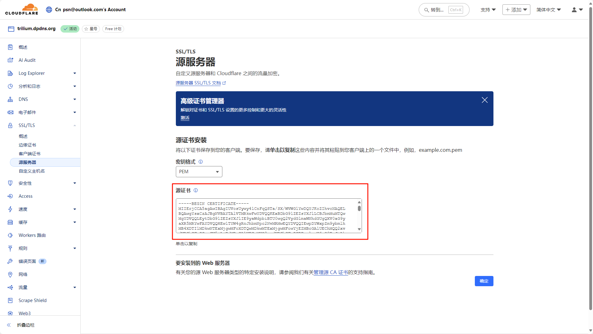 登录 Cloudflare → SSL/TLS → 源服务器 → 创建证书