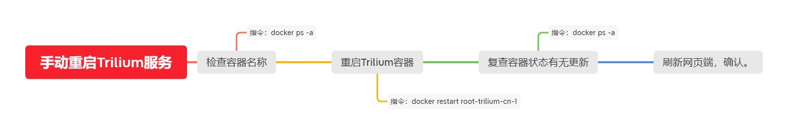 docker ps -a查看容器,看到 NAMES 列是root-trilium-cn-1或别的名字,就用那个名字重启: