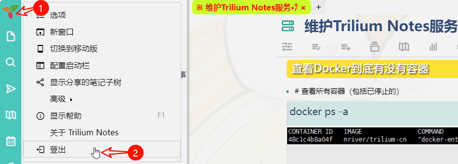 此时若刷新浏览器访问你的服务器IP:8080发现依旧无变化,则需要点击左上角的Trilium图标选择登出,然后重新登录;
